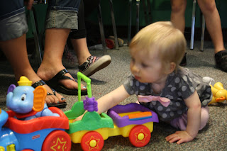 She is not walking yet, which most of her friends are, but she was also slow to crawl and slow to roll, so I'm not worried. Actually she's enough trouble as it is, I can only imagine what a problem she'll be once she can walk...